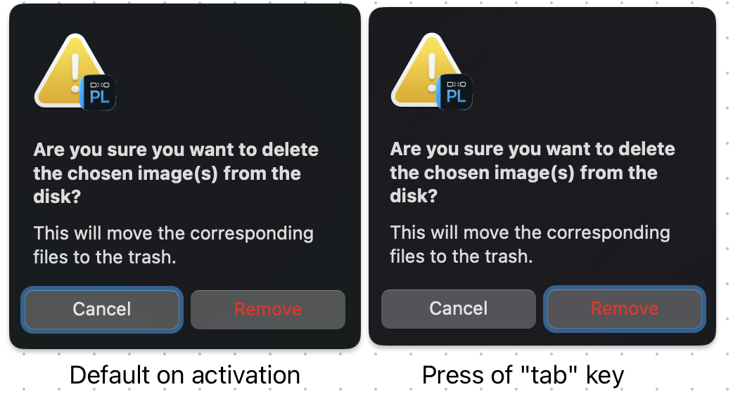 I wasn’t able to duplicate your suggestion using the tab key to move the default from cancel to remove and then using the return key to delete the image… For me pressing command+delete with cancel in white in the resulting dialogue box and then pressing return doesn’t cancel, it does nothing. The only key which seemed to have any effect is the escape key which cancels the action entirely.