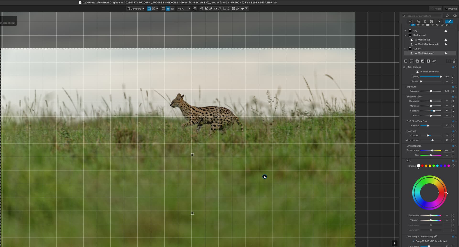 The AI-Animals mask has less issues with Serval Cats - Leptailurus serval < Leptailurus < Felinae < Felidae (cats) < Suborder: Feliformia < Carnivora (carnivorans) < Mammal – it was somewhat hit or miss. If one moves the subject detection pointer on to the animal in some cases it still misses. A problem of great natural camoflage.