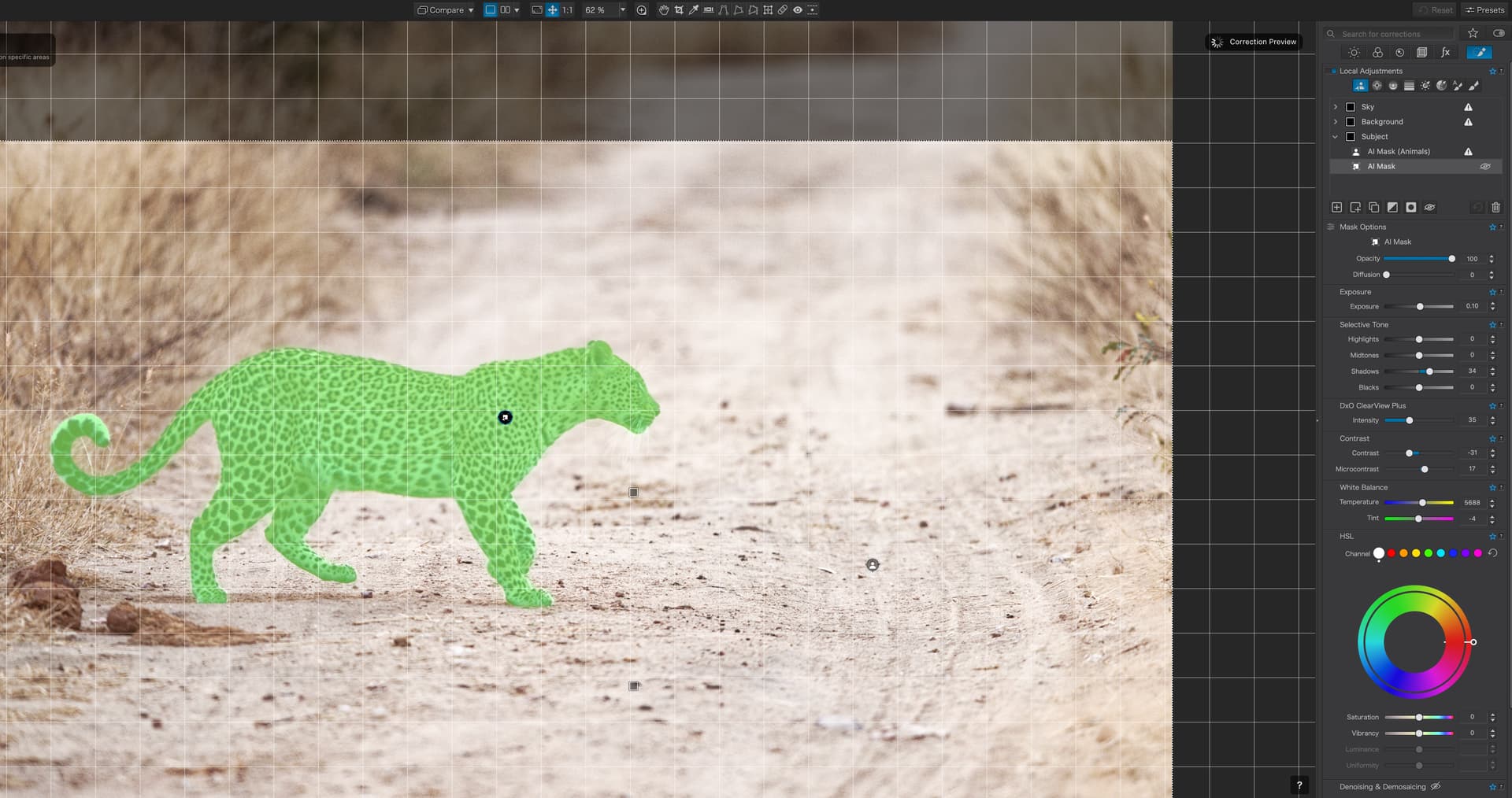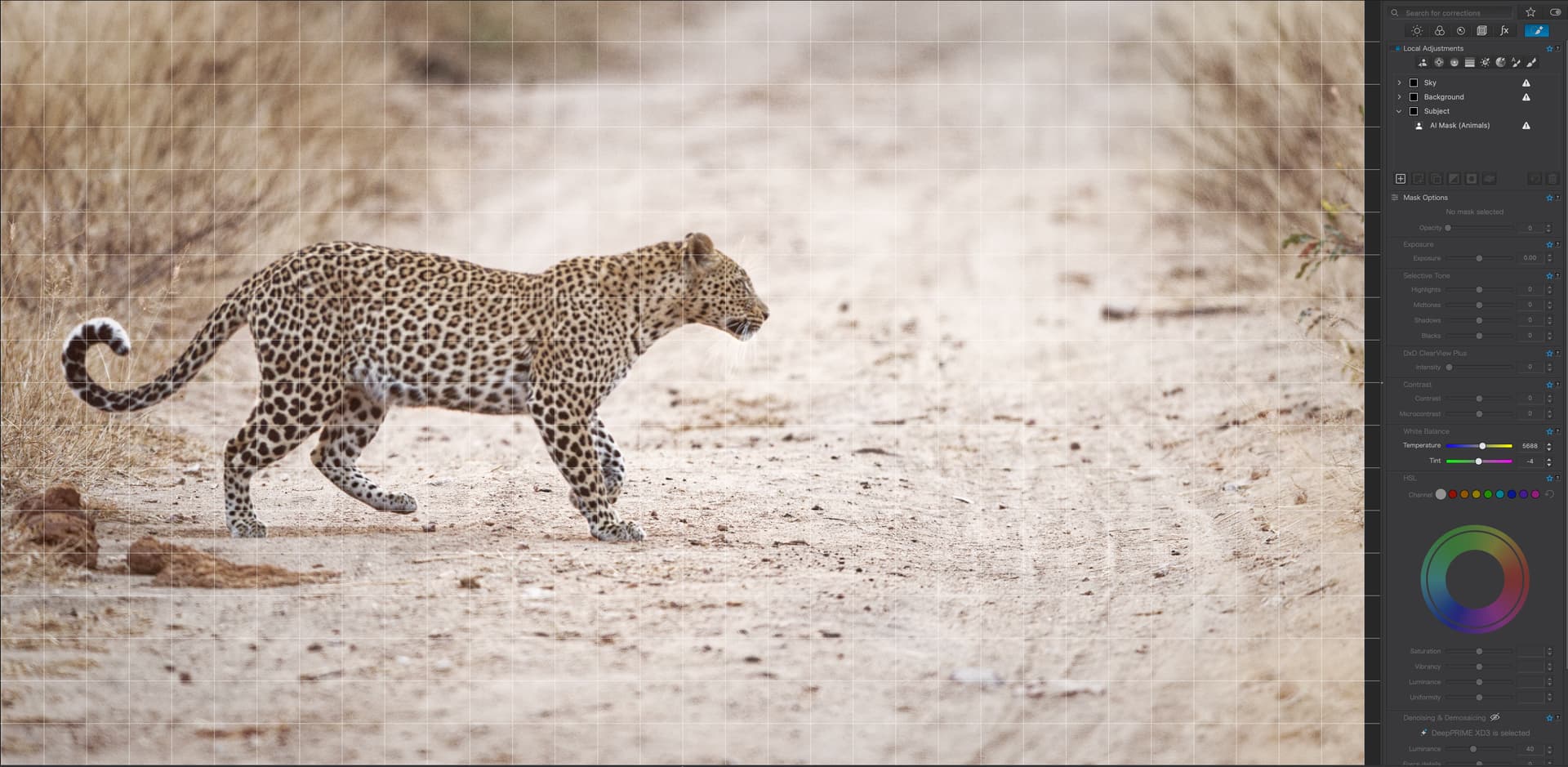 As shown in the attached one can use an undefined AI-mask and provided the target is in the open a mask can be generated. However, I prefer to build and use Presets that I apply to the thousands of images I shoot during a game drive so I prefer to apply 3 standard masks – Subject (Animal); Background (AI-Background, not AI-animal, not AI-sky); and Sky (AI-sky). I accept that these masks are purely a starting point – but to a large extent with Lions and other animals. They work well. But not with Leopards nor Cheetah, and infrequently with Serval cats. I will test with other species.