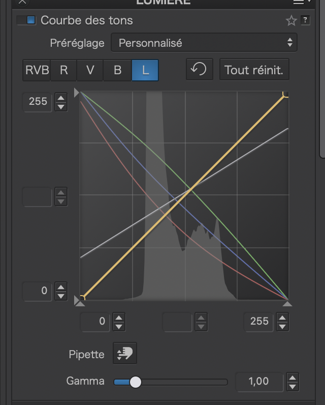 To me the channel lines going from top left to down right seems to be impossible with the rgb line going from down left to top right. Unless he has done something associated with a negative.