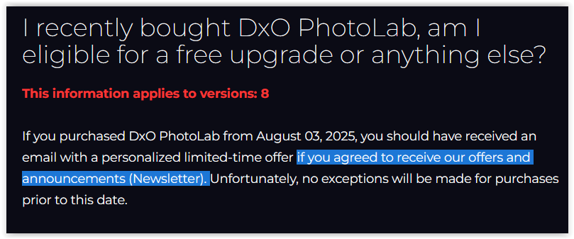 If you purchased DxO PhotoLab from August 03, 2025, you should have received an email with a personalized limited-time offer if you agreed to receive our offers and announcements (Newsletter). Unfortunately, no exceptions will be made for purchases prior to this date."