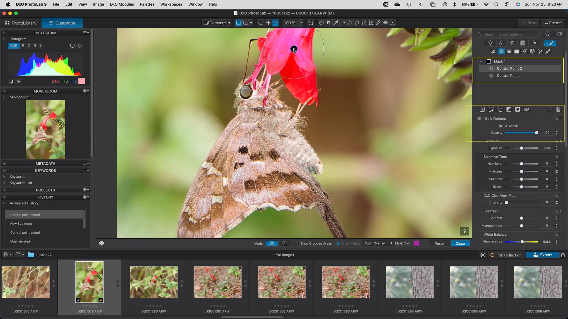 - Switch to the CP tool and click in the viewer to create a CP mask. The mask is displayed in the image viewer window, the submask list label changes to “Control Point”, but nothing changes in the Mask Options section. For my system, the label displayed in the Mask Options remains as “Sub mask 1” whereas your system appears to change to “Control Point”.
